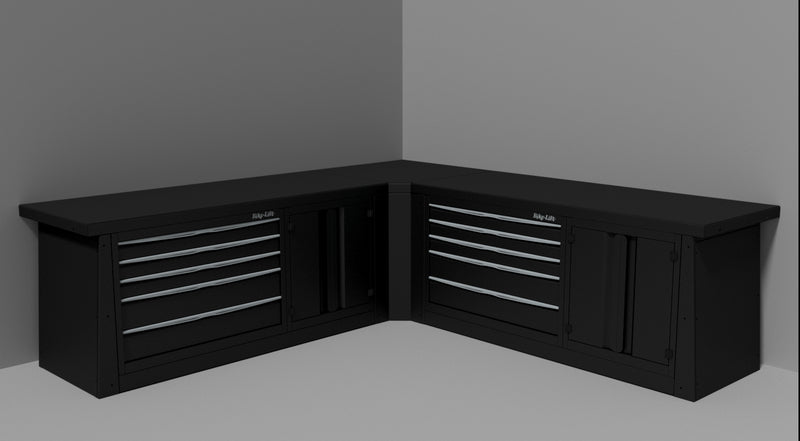 Corner furniture unit assembles two Bike Lift workshop furniture (89080002, 89080003, 89080004) for an L-shaped configuration.