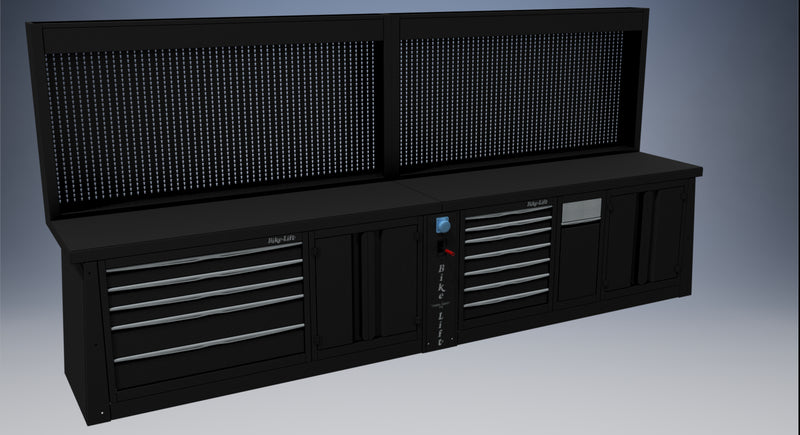 The corner unit assembles two Bike Lift workshop furniture (89080002, 89080003, 89080004) for an L-shaped configuration.