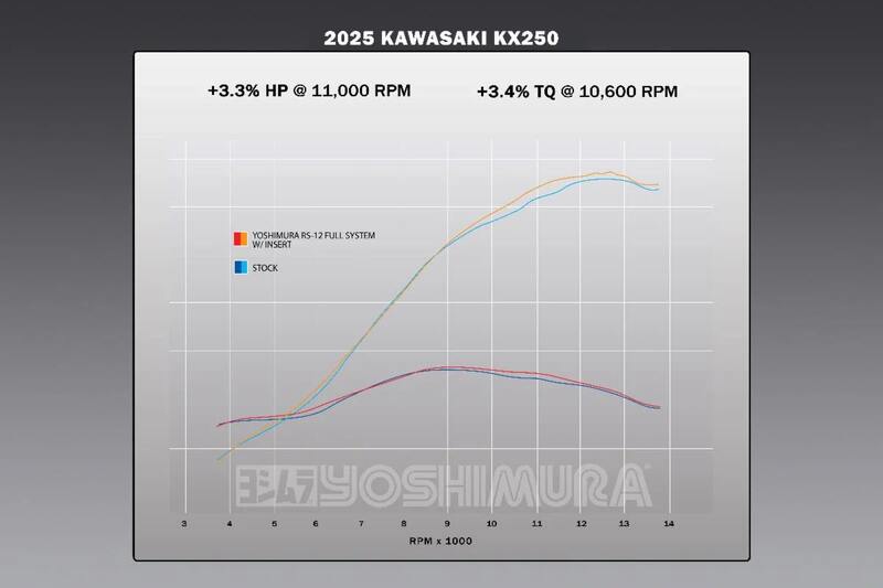 The latest KX250F boasts a new chassis and engine package. That meant it was time to go to work to see what can be done to add performance to the new KX. During development the new 250 was very responsive to our RS-12. We were able to add up to 3.3% more HP at 11,000 rpm and up to 3.4% more torque at 10,600 rpm. This gives the 2025 KX250F added power on top and more connectivity on the bottom and mid point of the power spectrum.