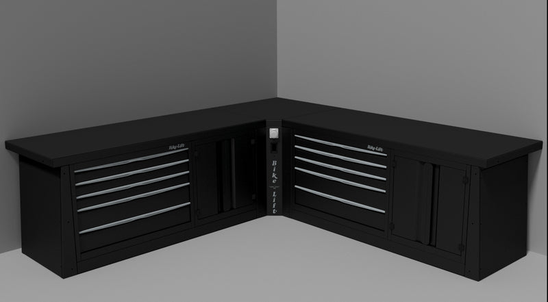 De lucht / elektrische hoekunit assembleert twee Bike Lift werkplaatsmeubelen (89080002, 89080003, 89080004) voor een L-vormige configuratie.